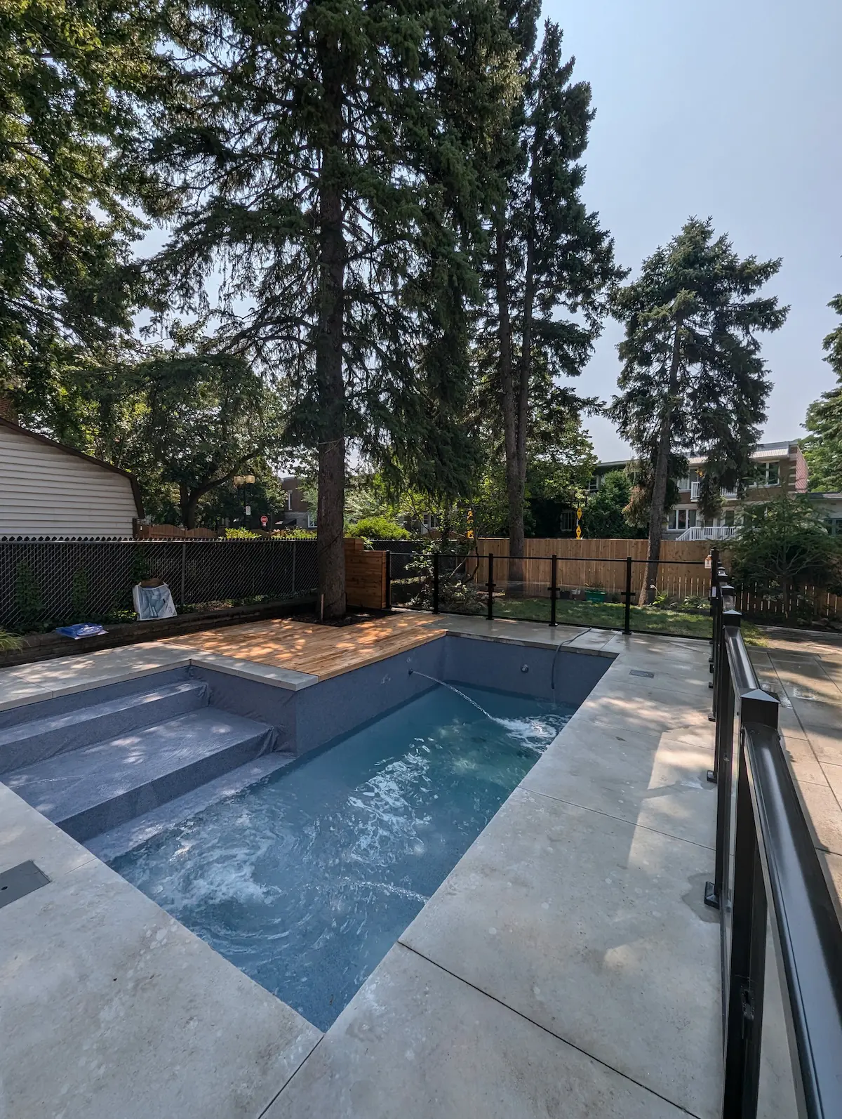 Terrasse arrière en dalle Blu grande lisse beige crème et marche Raffinato beige crème.